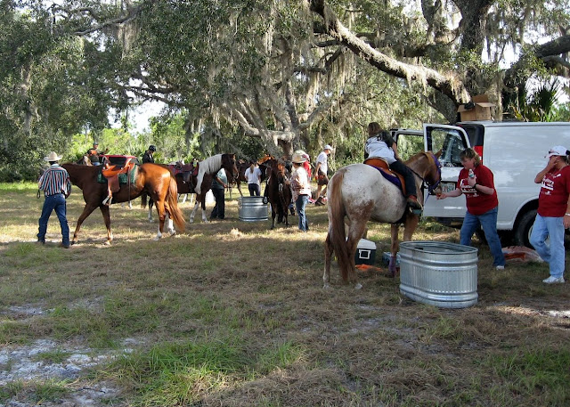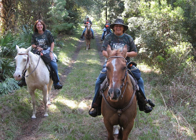 The 2008 FCTB Christmas gathering provided food, fun and entertainment for all. It was a full house at 7BarL, considering there was another club there and some stragglers scattered about. Friday it was overcast and we had light rain, but decided to make the most of the day and headed out for a good ride on the Suwannee tract. After about 2 hours we got back to camp and were treated to Sister Sarah’s good camp cookin’. We had mushroom salsa chili, home made mac-n-cheese and some tasty meatball subs, all topped off with a homemade apple cake. Friday night was highlited by our fireside chat, which covered such topics as Key West, Bimmy Juffet and some Elmis sightings. I think some of us hit the suds sooner than others! Saturday we had a good long ride. All managed to make it across the steel bridge, but the trail we planned to explore was a little scary, so we backtracked a little, crossed under the bridge and invaded the music park, where we got to play on the hilly trails and took advantage of their nice new bathrooms. We made it back to camp with no casualties (although Mustang and Linc did entertain us with some fancy piaffes and airs above ground) and all looked forward to Wildcat’s Low Country Boil. The dinner was excellent, and again the crowning glory was the delicious dessert, this time provided by Liz. Pinky and Susan joined us Saturday afternoon and we were entertained by their redneck camping accommodations, which involved climbing up a ladder and over a ramp to get into the back of the trailer where they slept. Sunday’s ride was the whole Mattair loop. We were happy to see the sun, since the rain brought in the cool weather. We managed to make it back to camp and have a quick snack before everyone packed up and headed home. A special congratulations goes out to Wildcat, who stayed in the saddle all weekend, and was quite tickled to see someone else get bucked off for a change. (Luckily not from our group!) Miss Cory won the prize for best rider- she and Beauty kept up with the big folks and showed us a thing or too about cowboying up! Check out Beauty's pink blaze. Thanks to everyone for contributing to these special memories. We are definitely a unique group…check out the rest of the photos